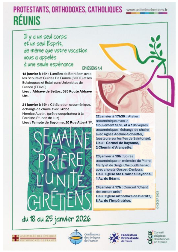 • Mercredi 21 janvier à 19h au temple de Bayonne, 20 rue Albert 1er : Célébration œcuménique, échange de chaire avec l’Abbé Hernice Austin, prêtre coopérateur à la Paroisse St Jean de Luz,
